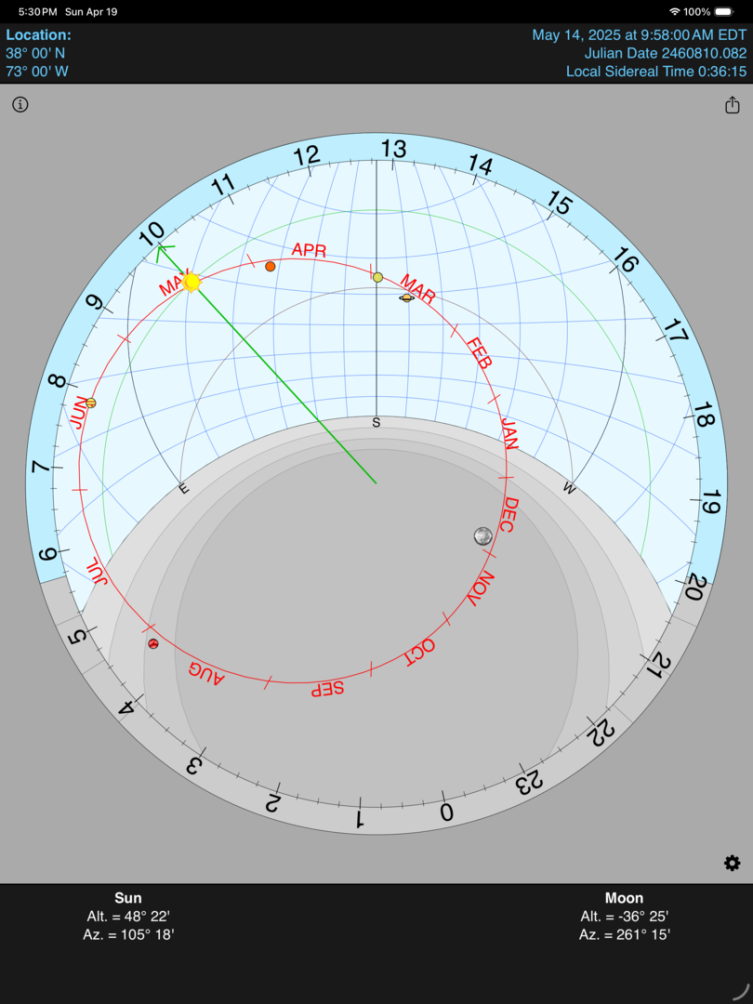 - Tapping the Sun icon toggles on and off a mode that allows the time of day to be changed interactively by dragging the time arrow with your finger. When this mode