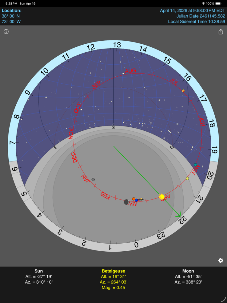 - The time arrow will follow your finger as you drag it around the screen. Use this to quickly check the rise, transit and set times of objects, or to see what the sky will look like at different